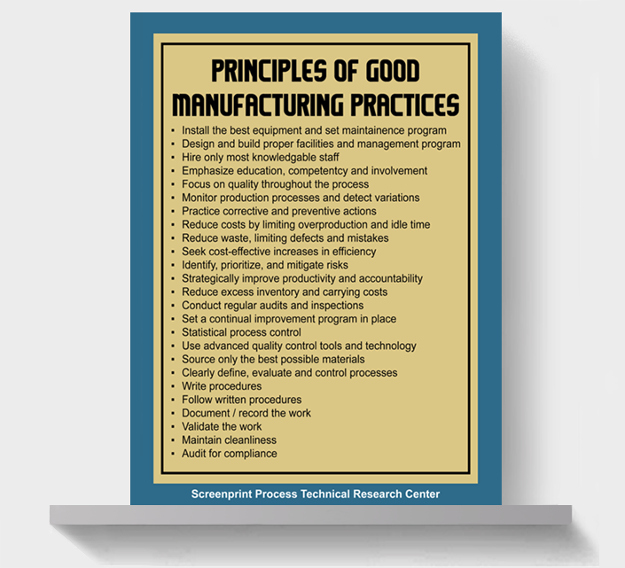 Good practices in the manufacturing of screenprinted products provide consistency in the system. The poster illustrates some of the steps to consider in meeting the Principles of Good Manufacturing Practices.