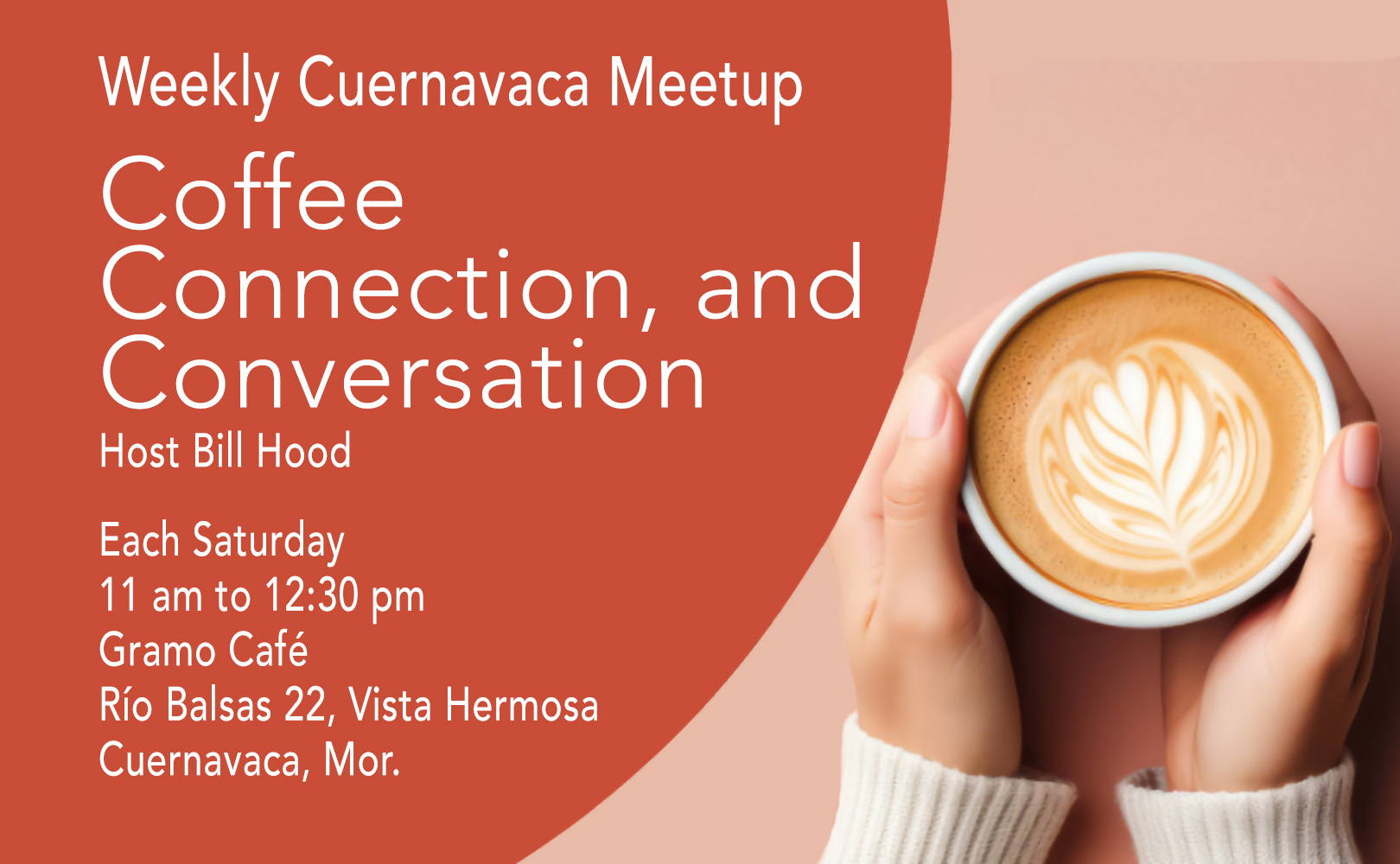 Cuernavaca Social Community is our informal social gathering for Coffee, Connection, and Conversation. We started as the Coffee Klatch in 2009 for members of the Newcomers Club who wanted to get together more often than once a month and have, through several changes of venues and times. Now, we meet once a week, every Saturday from 11 am to 12 noon at Gramo Café, located in the Teopanzolco Cultural Center, next to the Teopanzolco Pyramids in Vista Hermosa.